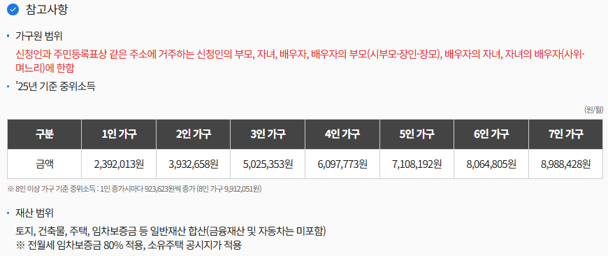 | 재산 조건 | 가구 재산 3억 5천만 원 이하 |