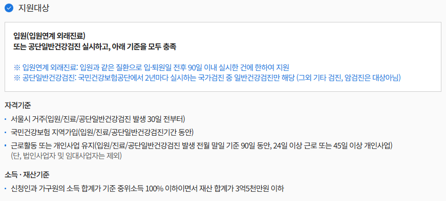 | 거주지 요건 | 서울시에 주민등록이 되어 있고, 입원일 기준 30일 전부터 서울 거주 |